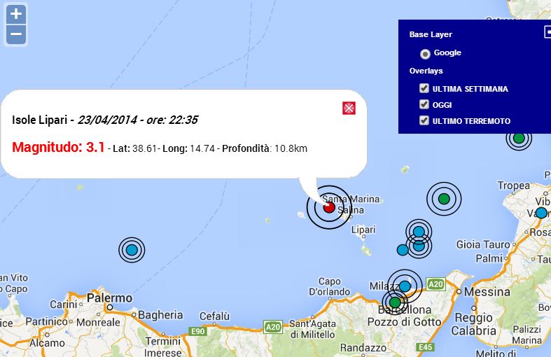 Terremoto oggi Sicilia, 23 luglio 2017: scossa M 2.5 .... Visualizzati terremoti da 1 a 30 dei 47 trovati (ordinamento tempo decrescente). Notizie sui terremoti in tempo reale, magnitudo dell'ultimo terremoto, epicentro del sisma, monitoraggio h24 con dati ingv, centro nazionale terremoti e usgs, centro internazionale. Notizie in tempo reale + elenco dei terremoti in atto con dettagli sull'epicentro del sisma e sulla magnitudo. Terremoti sicilia, sezione dedicata ai terremoti di oggi ed ultimi 7 giorni in sicilia aggiornata h24 con i dati ingv. La terra torna a tremare in sicilia dove oggi, poco prima delle 13:00 è stata avvertita una scossa di magnitudo 2.6 a 11 km a nord di ragalna, in provincia di catania. Www.siciliareporter.com alle 3.19 della notte, un'ulteriore scossa di magnitudo ml 4.8 è è avvenuto nella zona: Poco fa, alle ore 16:49 del 10 novembre, una scossa di terremoto si è verificata a troina, comune italiano di oltre 9mila abitanti della provincia di enna. Il gruppo di lavoro iside presso osservatorio nazionale terremoti ha beneficiato del contributo finanziario della. Una scossa di terremoto è stata avvertita questa notte da chi abita le province catanesi. La sicilia è una delle regioni più sismiche d'italia come frequenza e intensità dei terremoti. Pochi minuti fa è stata registrata una lieve scossa di terremoto nel settore orientale della sicilia, con epicentro in provincia di catania, proprio alle pendici dell'etna. Elenco dei terremoti in tempo reale in italia, europa e nel mondo. Aiutaci con le tue segnalazioni per identificare le zone colpite. Oggi, 8 marzo 2014, l'istituto nazionale di geofisica e vulcanologia di roma ha registrato una forte scossa di terremoto in sicilia nel distretto sismico dei monti nebrodi a messina. Cronologia degli eventi sismici disastrosi in sicilia con rilevante impatto sui beni architettonici, paesaggistici, storici, artistici, etnoantropologici e archeologici.